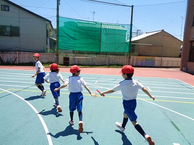 後半の時間に、バトンの受け渡し練習とリレーをしました。