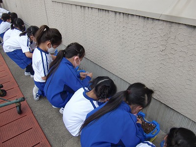 今日は、あさがおの種まきをしました。生活の時間は4時間目でしたが、お天気が心配なので2時間目に変更しての実施です。