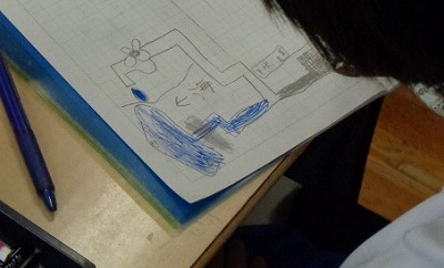 さらに、京都市で使われている水は、一体どこからやってくるのかを図に書いて予想しました。海からやってくるという人、川からやってくるという人、琵琶湖からやってくるという人、いろいろな予想がありました。