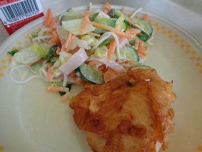 米粉のパスタは、小麦粉のパスタと比べてモチモチしているのが特徴です。少なめのマヨネーズで味つけしてしています。