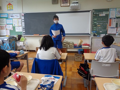 給食時間に、児童会本部メンバーが各学年教室へ「文教タイムズ」を届け、お話をしてくれました。