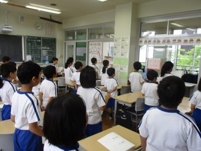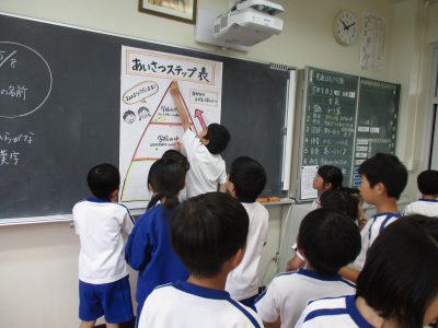 今日から始めたクラスの取り組み「あいさつステップ表」