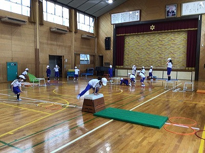 跳び箱やマット、なわとび、リング等を岩や川、綱渡りなどに見立て、それぞれのチームで協力しながら作りました。