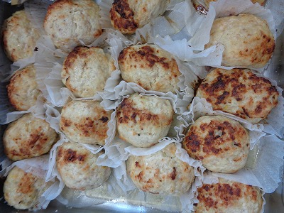 丸い形を作り、オーブンの鉄板に並べて焼いています。