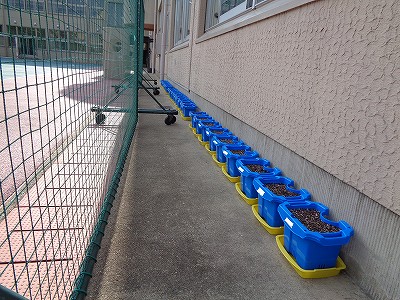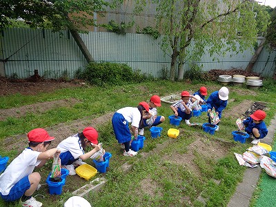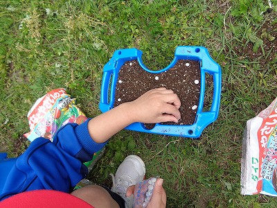 次に、人さし指で穴を開けて、一粒一粒の種を大事に植えます。