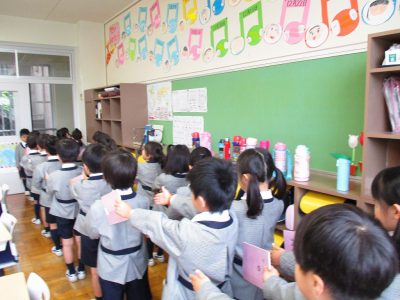 礼拝前の教室では、先頭の2人がみんなに声をかけて、きれいな2列を作ります。