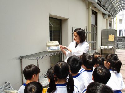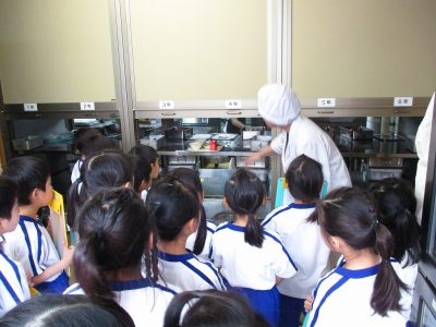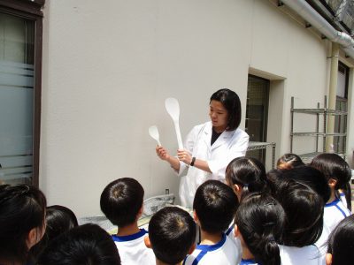 それらの道具の説明を聞き、栄養士の先生のお仕事の内容や思い、調理員さんが衛生面に気をつけておいしい給食を作ってくださっていることなどを学びました。