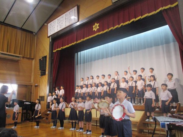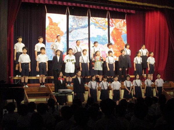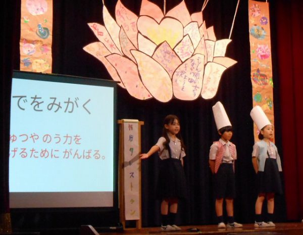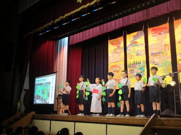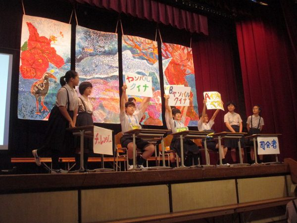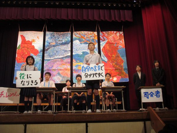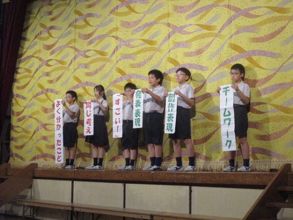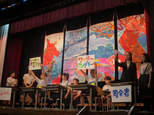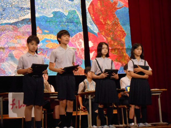 発表が終わると、恒例の鑑賞タイムです。全校生が自由に思ったこと・感想を伝える場です。それぞれのコメントに、発表学年は達成感を覚えます。