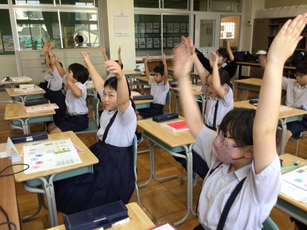 両手を挙げている子ども達は、「ヨ」の音と文字の形を体で楽しく覚えようと取り組んでいます。