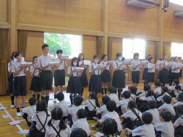 6年生は、芥川龍之介の「蜘蛛の糸」の冒頭文を音読しました。