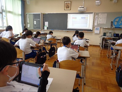 今日は各自が iPadに自分の意見を打ち込み、みんなに見てもらったり、自分の考えと比較したりしました。