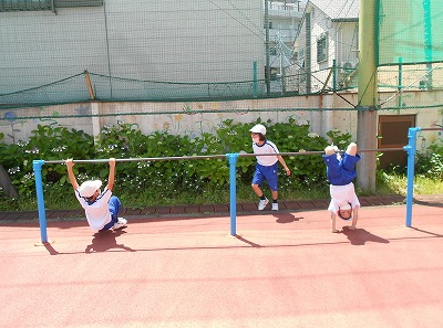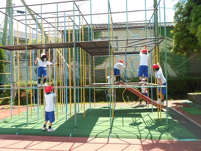 水分補給と手の消毒をしてから、元気に遊んでいます。