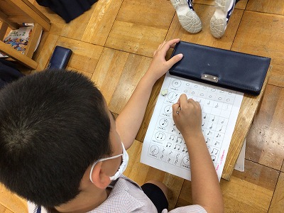 練習プリントの続きを進めています。少し長丸に書くことや棒の付け方など、形に注意しながら書いています。