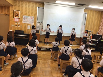「♪虫歯建設株式会社」(虫歯予防デーに合わせて)や「♪上を向いて歩こう」(全校で歌っています)の歌唱練習をした後は、「リズムまねっこ」を行いました。