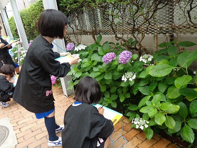 まず、小学校玄関にさいているアジサイを観察・スケッチしました。