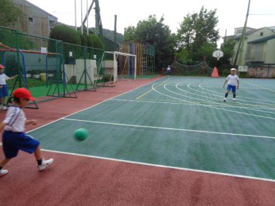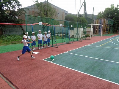体育では、キックベースの学習が始まりました。赤組と白組に分かれて、事前にルールを確認し、打順・守備位置も決めて、スタート。