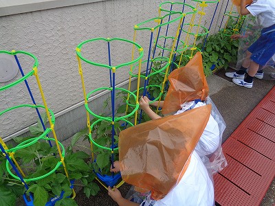 そこで、先週、雨のためできなかったアサガオの支柱立てを行いました。