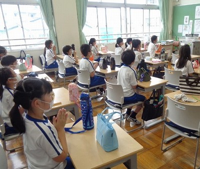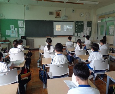 ZOOMで各学年の様子も前のスクリーンにうつり、いつもの放送礼拝とはまたちがった雰囲気で校長先生の話を聞きました。その後、学校生活の過ごし方についてふりかえりました。