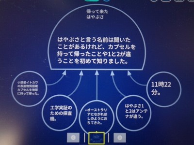 今日は「よりよいみらいをつくるもの」というテーマで、宇宙船はやぶさについて学習をしました。まず、ロイロノートを使ってハヤブサについて調べ、シンキングツールのクラゲチャートにまとめました。