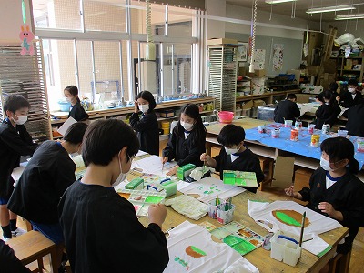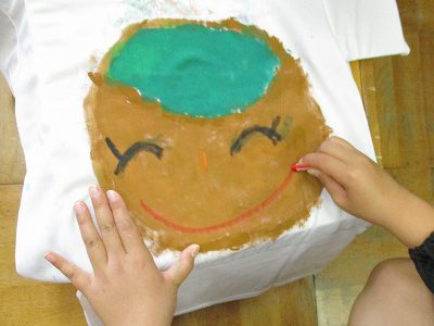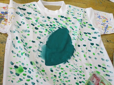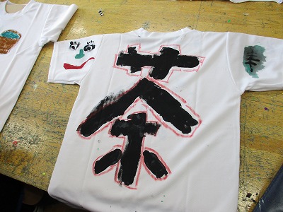 自分で考えたキャラクターを描いたり、チームでワンポイントを揃えたりしながら、布用絵の具やクレパスで描いています。