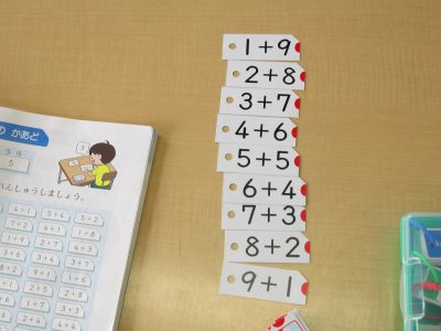 今日は、絵を見て問題を作った後、たし算カードを使って学習を進めました。