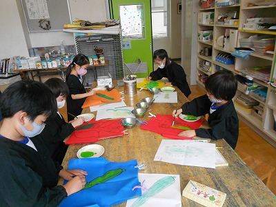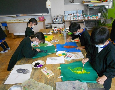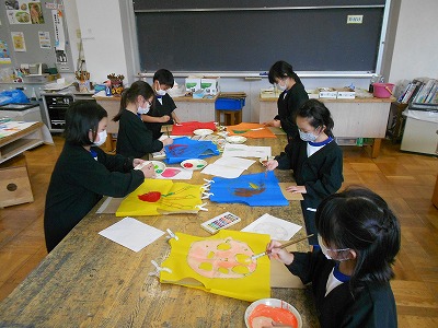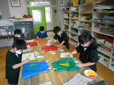 布用のクレパスで下描きをしてから、絵の具で塗っています。