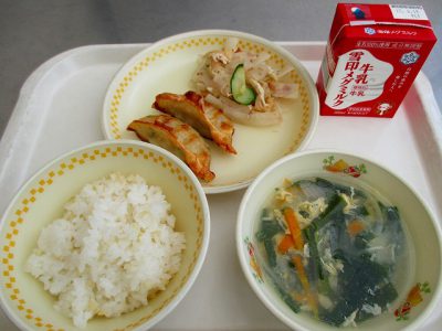 今日の献立は「ぎょうざ・大根の梅あえ・ニラと卵の中華スープ」でした。