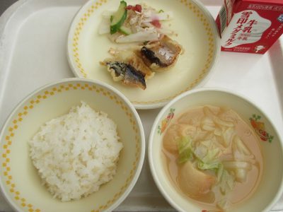 今日の献立は「鯖の竜田揚げ、大根の梅あえ、キャベツの味噌汁」でした。