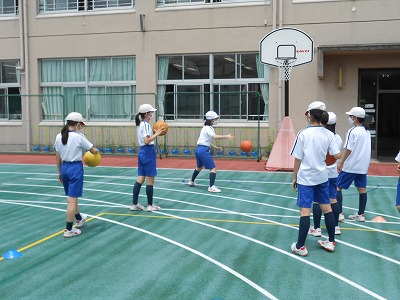 今日は基礎練習を終えた後、3対2のハーフコートゲームを行います。3対2は、デフェンスの数が少なく、攻撃側がシュートしやすい人数になっています。あいている人を見つけてパスしたり、ボールをもらえる場所に移動する練習を積み重ねます。