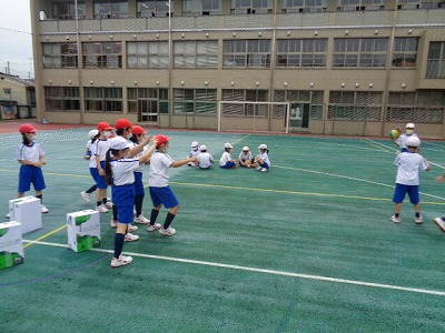 ゲームの前に、ボールを投げる・捕る練習を行いました。