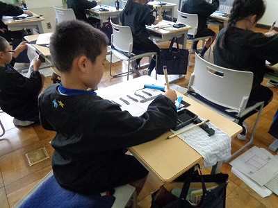 名前を書く時に「手がふるえる…」と何人かがつぶやいていました。小筆の筆先で小さく書くのが一苦労です。