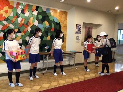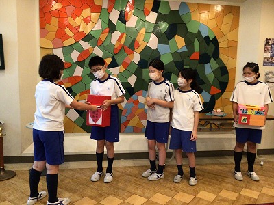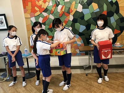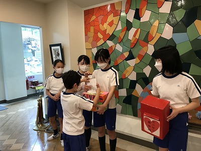 募金箱の持ち手を交替して、教室に呼びかけに行くなど、金曜日まで活動していきます。メッセージが記された募金袋を見て、笑顔になる文教ボランティアメンバーでした。