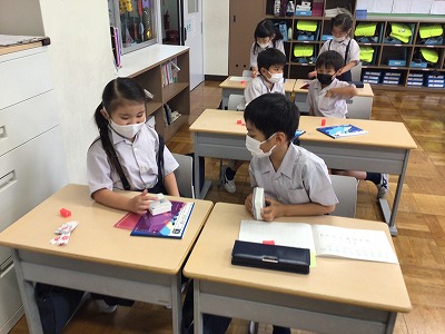 そして、算数の時間、まず、おはじきを使って問題を出し、ペアの人に答えてもらう活動をしました。