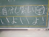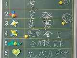 最後にふと、教室の時間割黒板を見ますと「自分も楽しみ」「全力投球で」という時間割係さんからのメッセージが書かれていました。
