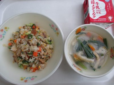 焼き豚、人参、ピーマン、長ネギ、卵が入ったチャーハンです。人参などの野菜は、食感が残るように大きめに切っています。先に蒸して火を通すなど、ひとつずつ丁寧に調理してくださいました。五目チャーハンは残食なしでした!