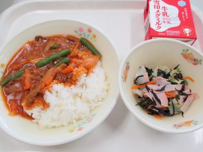 今日の献立は「ハヤシライス、ひじきのサラダ」でした。