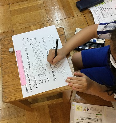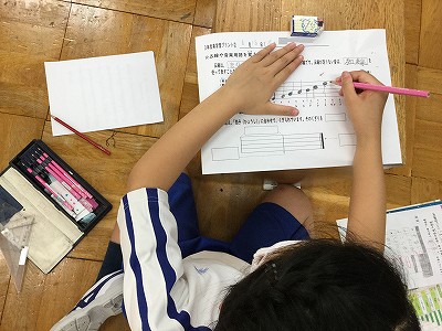 さて、今日は「音の高さ」について、プリント学習を進めました。五線の名前を確かめた後は、「ト音記号」の学習です。トの音(第二線)を囲むように書き始めて…