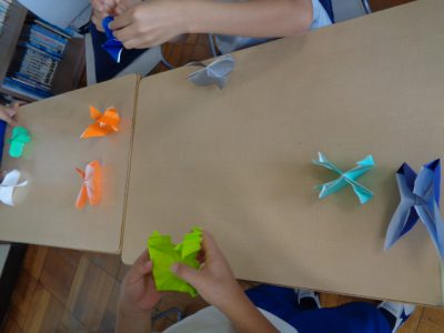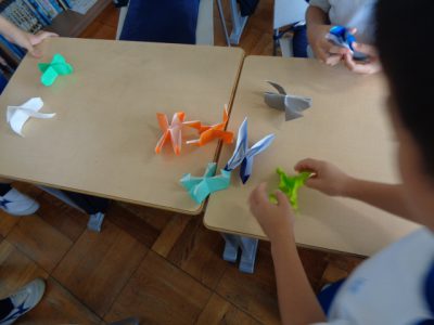 机に向かって課題に一心に取り組む姿あり、体育授業では、新たに「ソフトバレーボール」に喜々として取り組む様子あり。休み時間には、「折り紙バトル」略して「折りバト」を発明!?もあり。