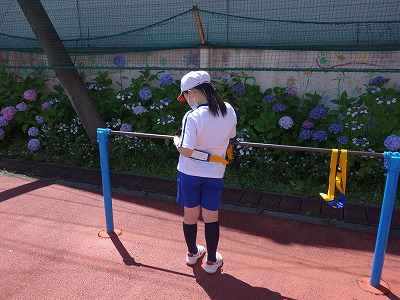 今日からまた鉄棒の学習に戻りました。今日は、逆上がりで腕の曲げるタイミングが分かりにくい児童に、補助ロープを使って練習してみました。