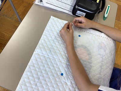ご覧ください!縫い目も均等に、ていねいな仕事っぷりです。世界に1つのナップザック完成まで、もうひとがんばりです。