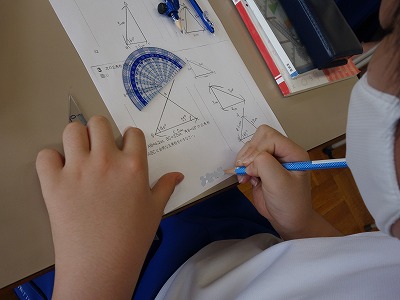 三辺、二辺夾角、二角夾辺と、どの辺の長さを決めればいいのか、どの角の大きさを分度器で測るのか、ていねいに確認しながら作図をしました。