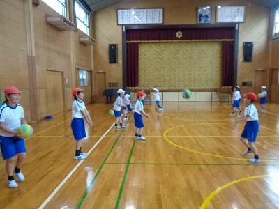 体育の学習です。雨のため、体育館で取り組みました。はじめに、立ちはばとびをしました。うでをしっかりふって、遠くへジャンプ!今日は、自分の記録がどのぐらいか実際に測ってみて知ることができました。その後は、バレーのサーブを下からうつ練習や、ボールをかえす練習をしました。