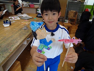 絵本「じゃりおじさんのさんぽみち」のお話から、ペープサートに表した登場人物を散歩道で歩いてもらおうという題材です。