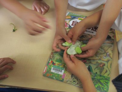 読み聞かせの後は、そら豆の実物を見て、チーム毎にさやをむきました。