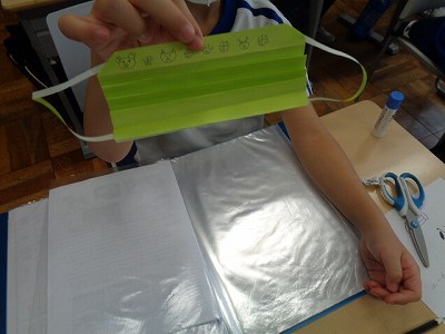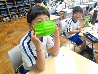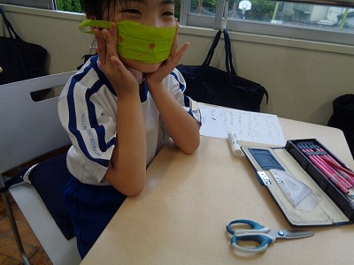 中間休み、保健係さんが、手作りマスクの作り方をレクチャーしてくれました。昨日の休み時間に説明の仕方を練習してくれていたので、とってもわかりやすく伝えてくれていました。作っていくと楽しくなってきて・・・