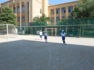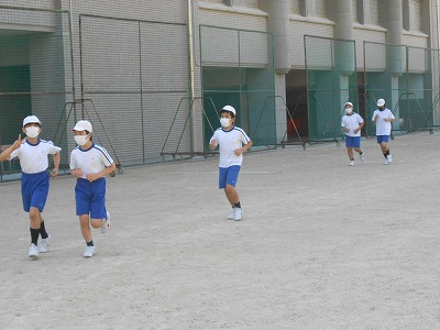6年生では、グラウンドの5分間走を行っています。自分が走り続けることのできる一定のペースを見つけることが目標です。5分間を同じスピードで走れるよう、調節しながら練習をしています。