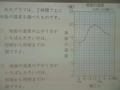 上の表は、グラフを黒板のスクリーンに写し出したものです。地面の温度の変化の折れ線グラフを見て、温度の上がり方や下がり方の傾きに目をつけました。特に傾きが急なのはどの時間なのか読み取りました。