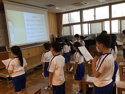 全校のみんなが練習する曲“心から心へ”を歌いました。