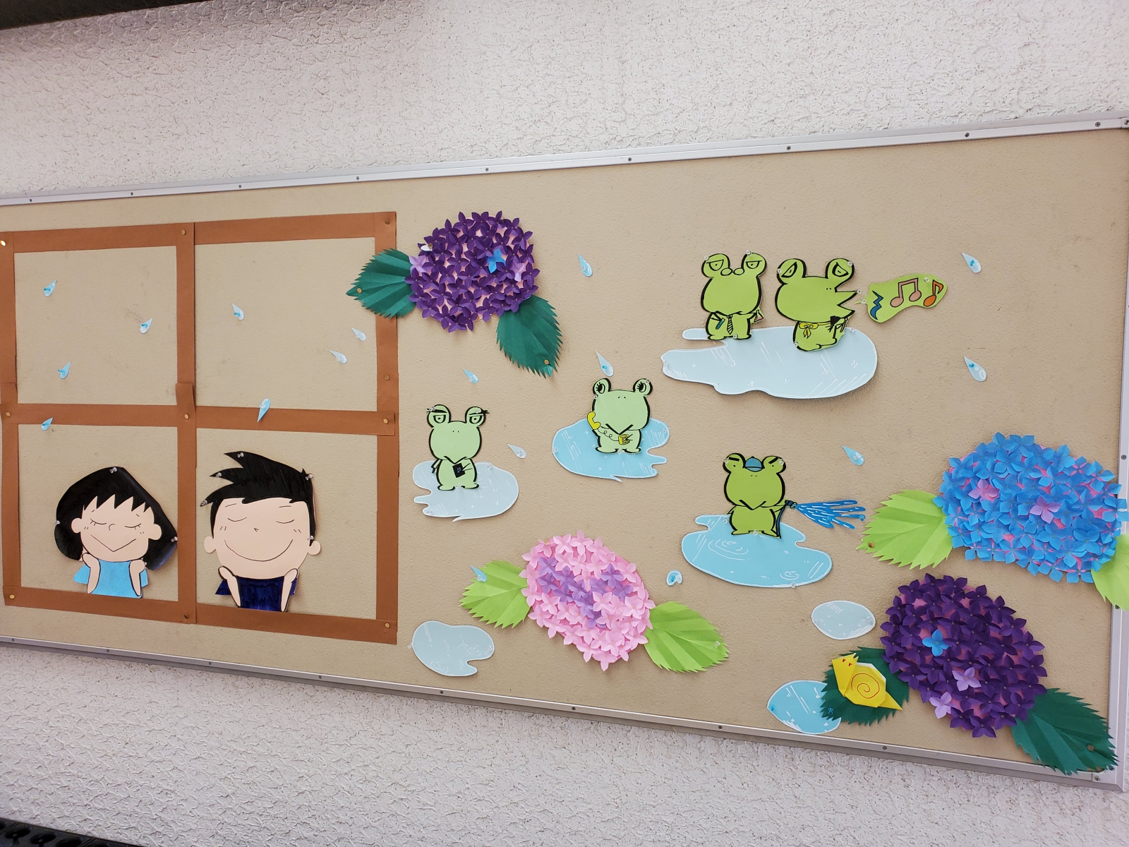 梅雨といえば、じめっとしていて、どちらかといえばいいイメージを持っていない人が多いかもしれません。でも、あら不思議。この掲示を見ていると、そんな気分はどこかへ。どうしてでしょう。