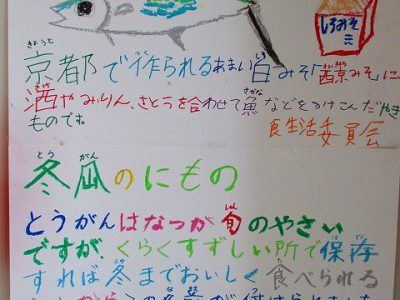 食生活委員会が「さわらの西京焼き」と「冬瓜の煮物」の紹介を描き、先週から掲示していました。